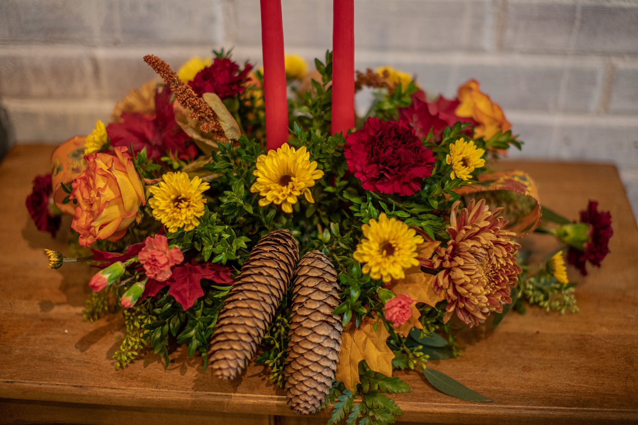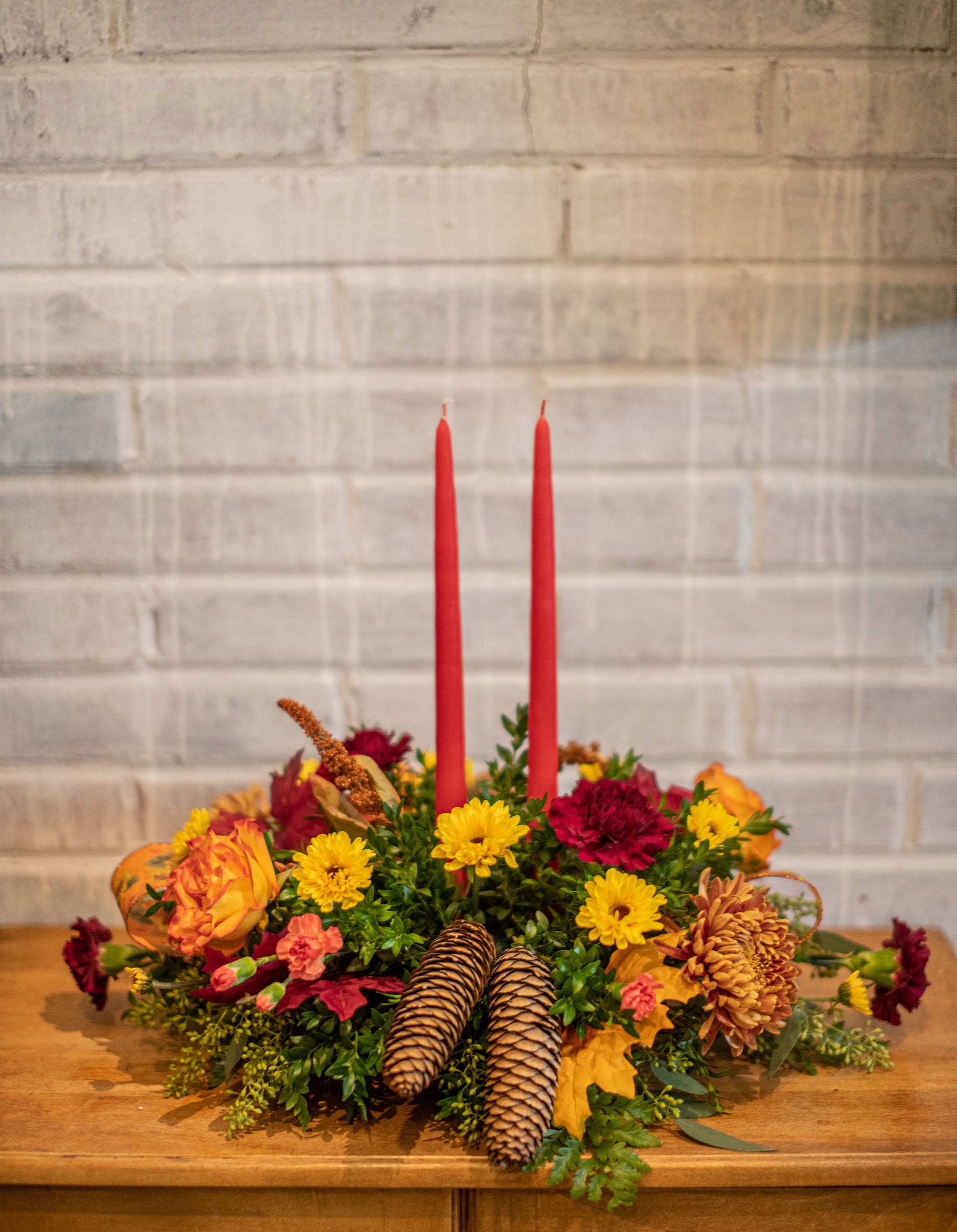 Bring flowers to the table this Thanksgiving. Our designers custom make each long and low centerpiece arrangement using the freshest and most radiant fall florals. Everyone will still be enjoying these florals even after the turkey is gone. Choose from the double tapered candle center piece, a single or a beautiful simple long and low.