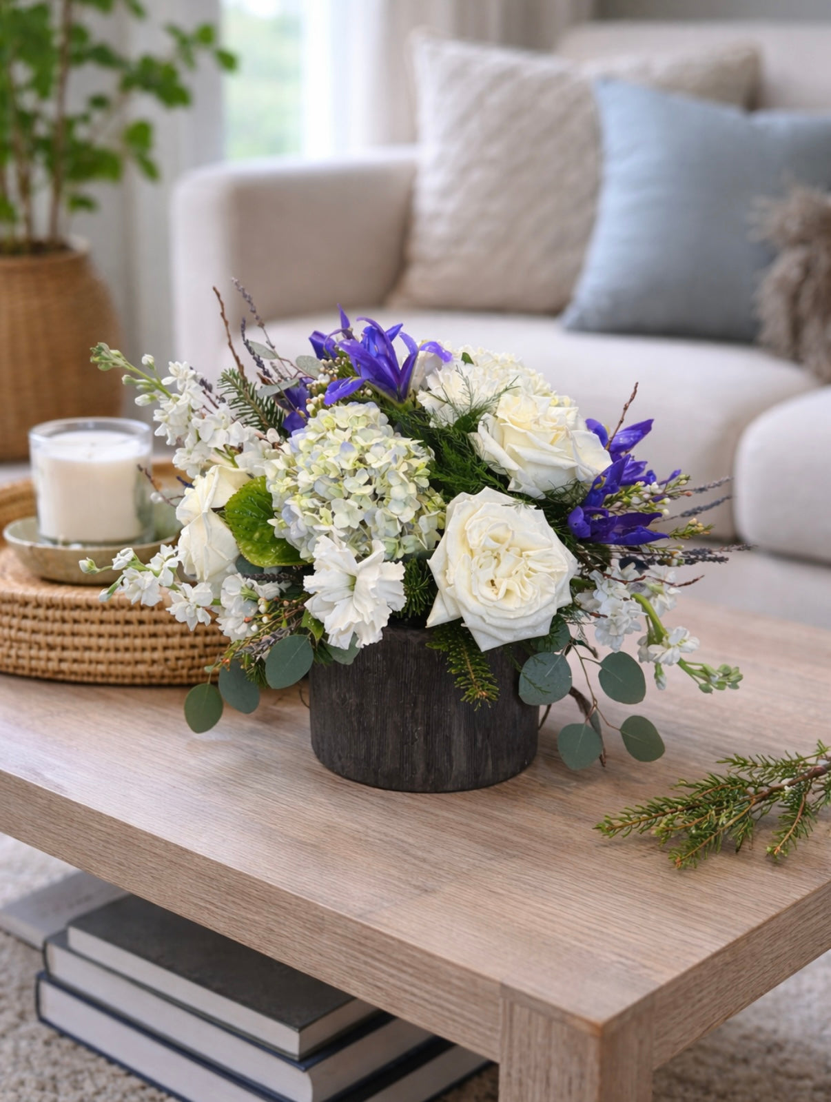 soft, elegant, and effortlessly beautiful. this arrangement brings a sense of calm and sophistication to any space. lush white roses and creamy hydrangeas are artfully accented with delicate blue blooms, fresh greenery, and subtle textural elements all throughtfully designed in a moder vessel.