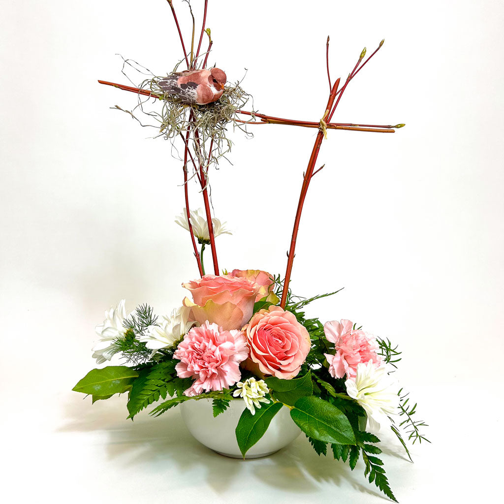 This bouquet features three roses, three carnations, and a pom, all delicately arranged with a nested bird figurine. Enjoy these beautiful flowers' bright colors and thoughtful synergy brimming with life and energy.