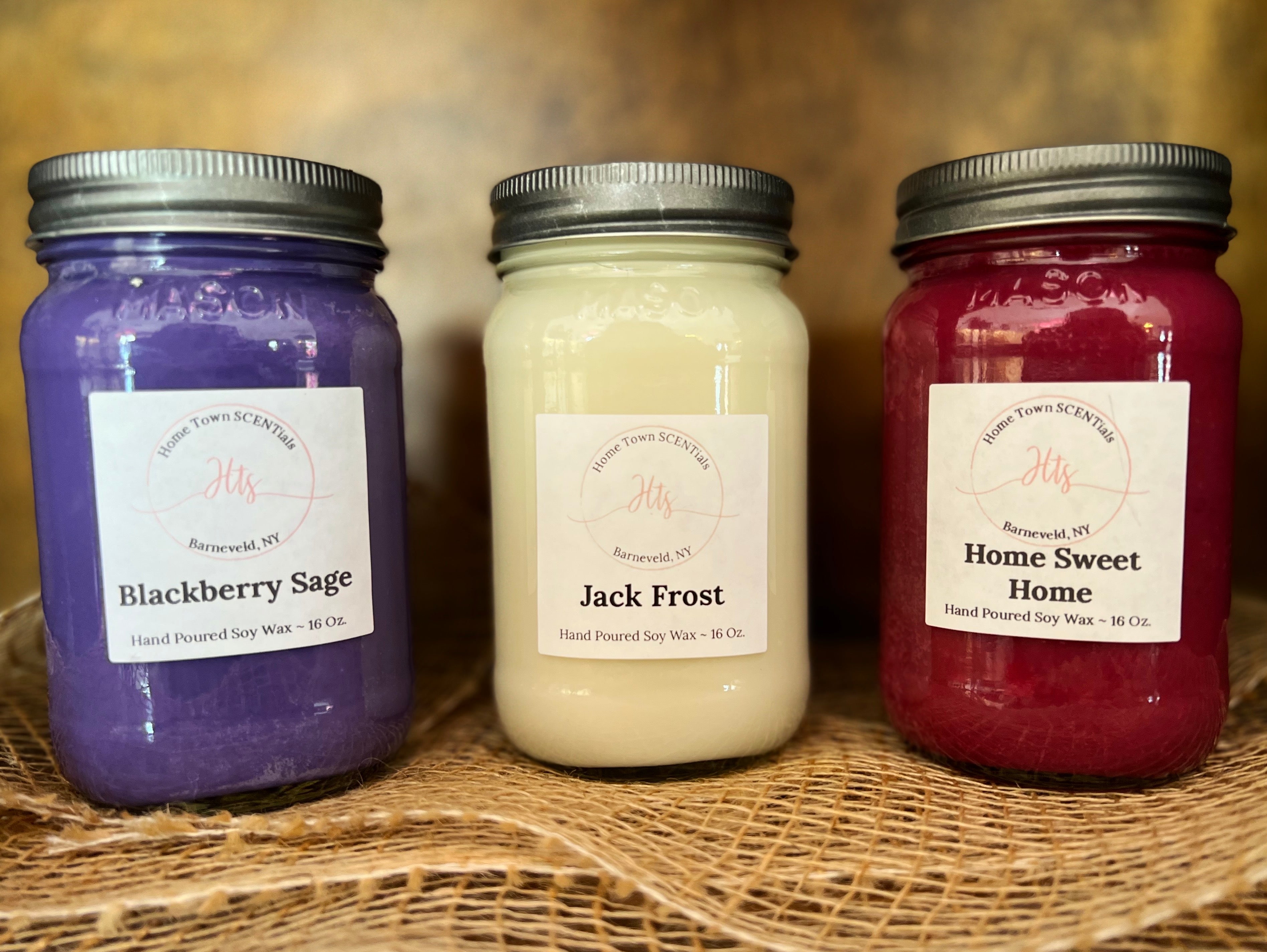 These hand poured Soy Wax Candles were made by HomeTown SCENTials in Barneveld, NY. The 16 oz. mason jar candles come in a variety of scents. Call for scents.