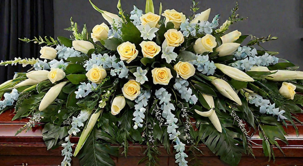 A time less expression of love and remembrance, eternal grace features soft ivory roses and elegant white lilies, accented with delicate blue florals and lush greenery. designed in a full classic length style, this casket spray offers a peaceful dignified tribute that honors a life with beauty serenity and heartfelt respect.