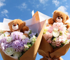 A stylish floral bouquet with the perfect bear hug wrapped in colorful paper.