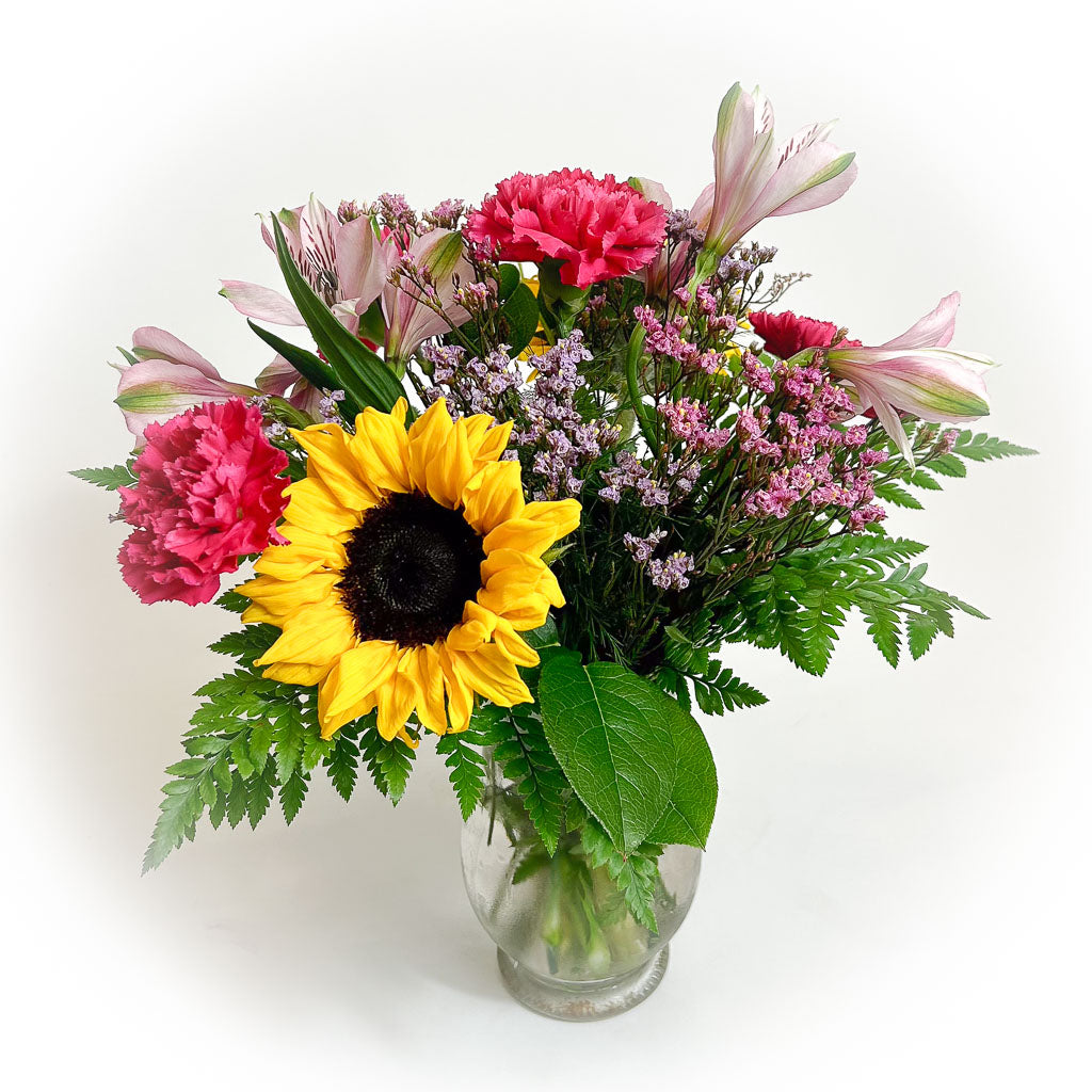 Preserve your happiest moments with a Sunny Memory! Our bouquet of beautiful alstroemeria and sunflowers, carefully wrapped with a bow, is sure to delight your special someone. With sunny colors to reflect your joy, this bouquet will bring smiles to everyone.