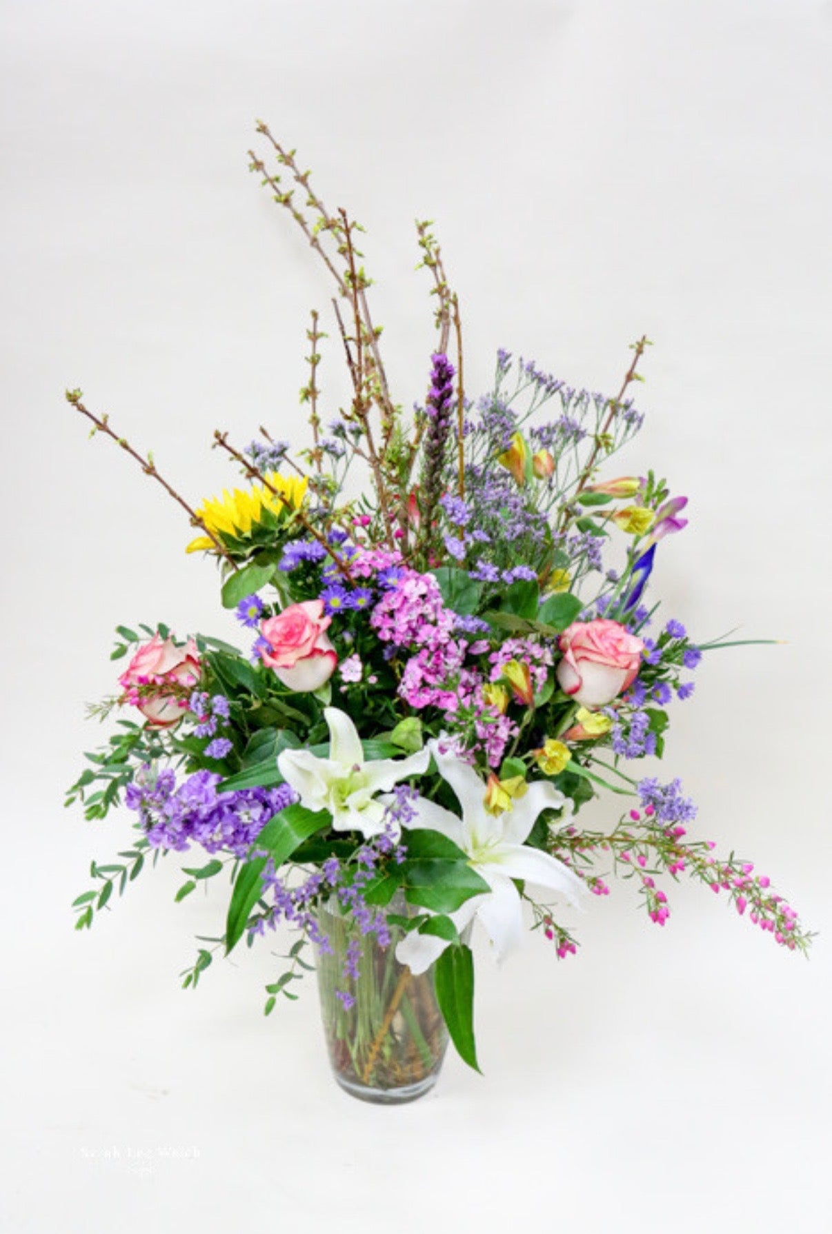 A lively garden style arrangement featuring soft pink roses, elegant white lilies, sunny yellow accents, and delicate lavender blooms - artfully gathered with fresh greenery to evoke the beauty of a wildflower meadow in full bloom.